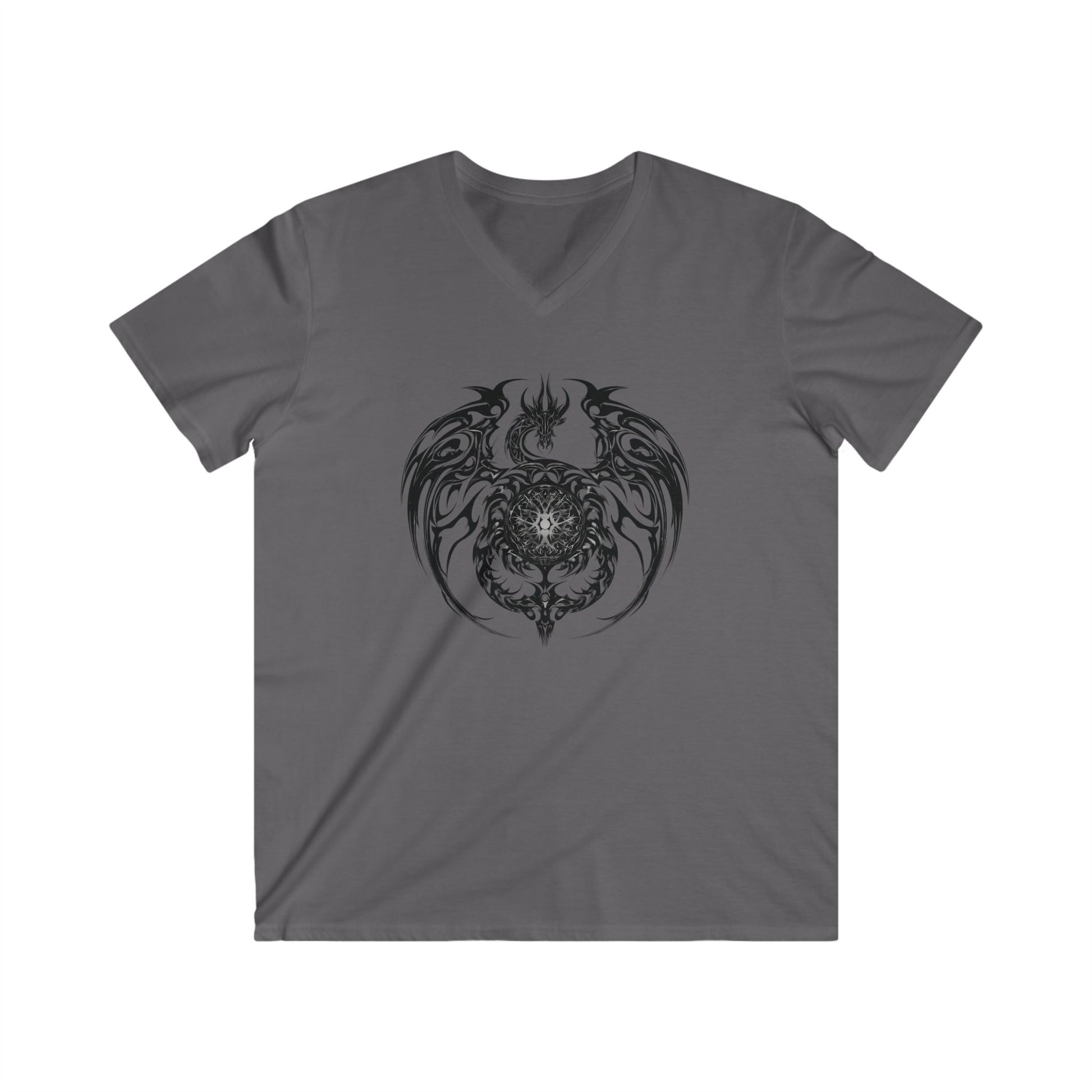 Elevate your casual style with this men’s fitted v-neck short sleeve tee featuring a tribal abstract dragon design in a circular form. The bold, artistic dragon symbol blends power and elegance, making it a standout piece for anyone who values strength, culture, and modern streetwear style.