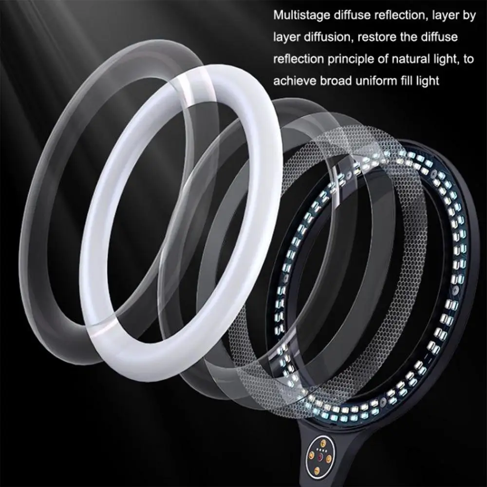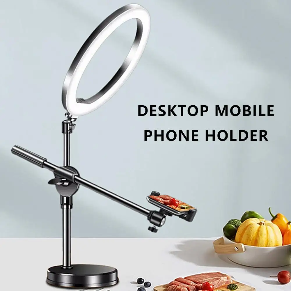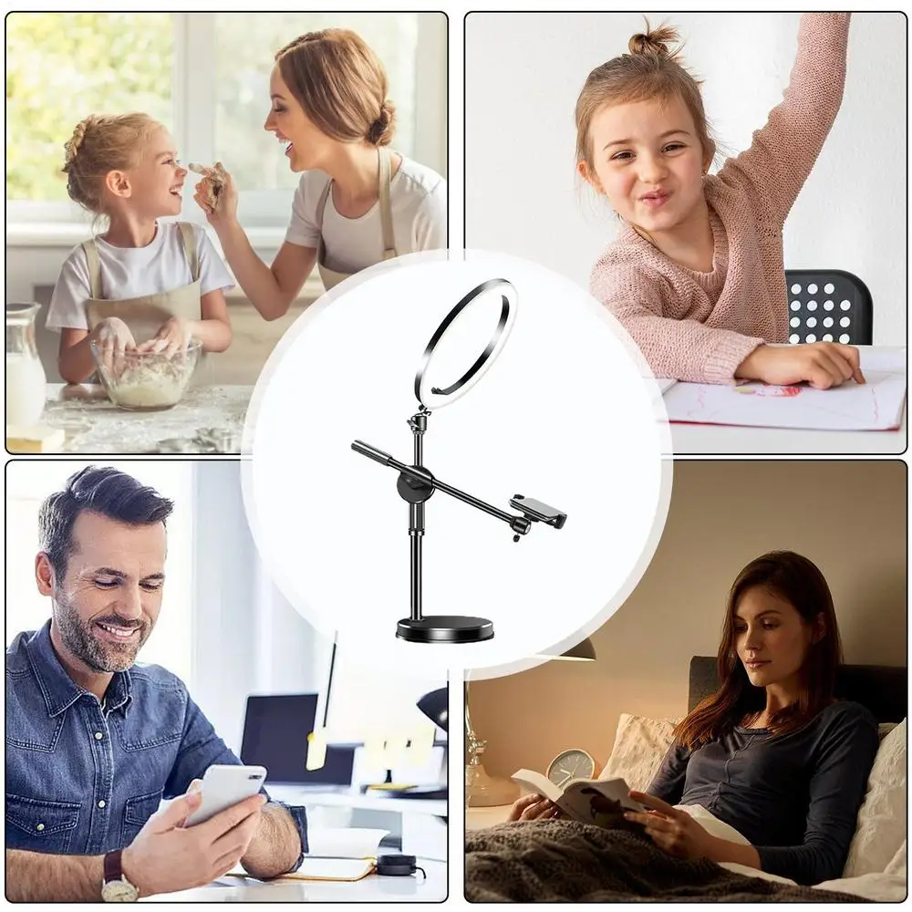 2.Advanced Illumination: Rejuvenate your photography or live streaming with the overhead phone mount that comes with a 26cm ring fill light. Customize the lighting with 3 color modes & 9 brightness levels, breeze through visuals like never before.
